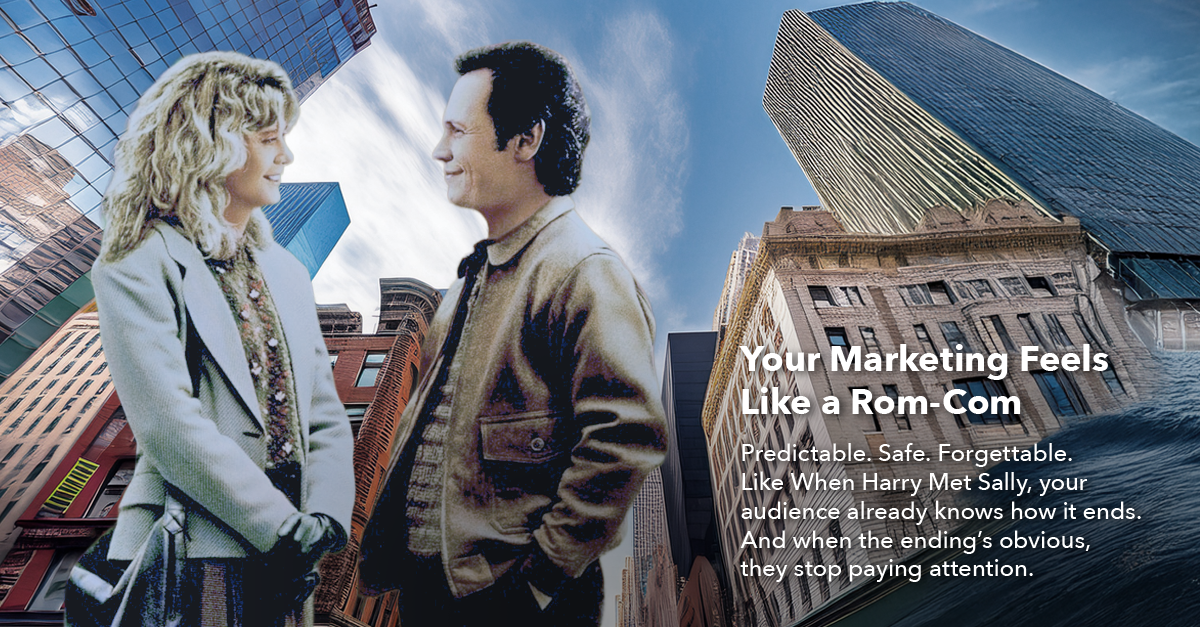 Marketing too often feels like a rom-com. The script is familiar: the When Harry Met Sally meet cute, the corny one-liner, the inevitable happy ending. Safe. Predictable. Forgettable. But your audience isn’t looking for a love story—they’re bracing for survival. Their attention is under attack. Their choices are overwhelming. And the brands that bore them? They don’t get a second chance.